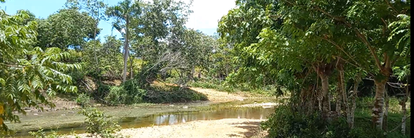Nach dieser entspannten Abkühlung geht es dann weiter. Durch den Fluss durch und wir befahren einen Weg, wo wir definitiv auf Pfützen treffen werden. Durch tolle Natur, vorbei an Kühen, Pferden, Eseln und was uns noch über den Weg läuft. Nach einem Weilchen kommen wir dann in einem abgelegenen Dorf an. Um die 5 bis 7 Häuser, ein Colmado (Tante Emma Laden) und eine öffentliche Schule.